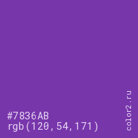 Цвет #7836AB в цветовой модели RGB обозначается тремя октетами (120, 54, 171) в десятичном формате и #7836AB в шестнадцатиричном (hex) формате, которые являются интенсивностью красного 120 (hex 78), интенсивность зелёного 54 (hex 36) и интенсивность синего 171 (hex AB).
