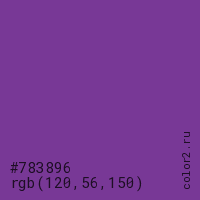 Цвет #783896 в цветовой модели RGB обозначается тремя октетами (120, 56, 150) в десятичном формате и #783896 в шестнадцатиричном (hex) формате, которые являются интенсивностью красного 120 (hex 78), интенсивность зелёного 56 (hex 38) и интенсивность синего 150 (hex 96).