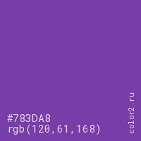 Цвет #783DA8 в цветовой модели RGB обозначается тремя октетами (120, 61, 168) в десятичном формате и #783DA8 в шестнадцатиричном (hex) формате, которые являются интенсивностью красного 120 (hex 78), интенсивность зелёного 61 (hex 3D) и интенсивность синего 168 (hex A8).