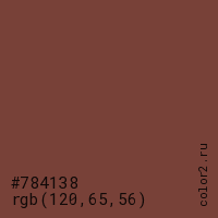 Цвет #784138 в цветовой модели RGB обозначается тремя октетами (120, 65, 56) в десятичном формате и #784138 в шестнадцатиричном (hex) формате, которые являются интенсивностью красного 120 (hex 78), интенсивность зелёного 65 (hex 41) и интенсивность синего 56 (hex 38).