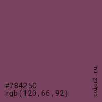 Цвет #78425C в цветовой модели RGB обозначается тремя октетами (120, 66, 92) в десятичном формате и #78425C в шестнадцатиричном (hex) формате, которые являются интенсивностью красного 120 (hex 78), интенсивность зелёного 66 (hex 42) и интенсивность синего 92 (hex 5C).