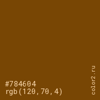 Цвет #784604 в цветовой модели RGB обозначается тремя октетами (120, 70, 4) в десятичном формате и #784604 в шестнадцатиричном (hex) формате, которые являются интенсивностью красного 120 (hex 78), интенсивность зелёного 70 (hex 46) и интенсивность синего 4 (hex 04).