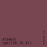 Цвет #784651 в цветовой модели RGB обозначается тремя октетами (120, 70, 81) в десятичном формате и #784651 в шестнадцатиричном (hex) формате, которые являются интенсивностью красного 120 (hex 78), интенсивность зелёного 70 (hex 46) и интенсивность синего 81 (hex 51).