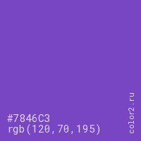 Цвет #7846C3 в цветовой модели RGB обозначается тремя октетами (120, 70, 195) в десятичном формате и #7846C3 в шестнадцатиричном (hex) формате, которые являются интенсивностью красного 120 (hex 78), интенсивность зелёного 70 (hex 46) и интенсивность синего 195 (hex C3).