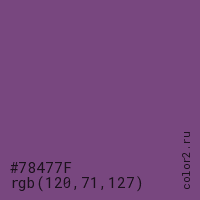 Цвет #78477F в цветовой модели RGB обозначается тремя октетами (120, 71, 127) в десятичном формате и #78477F в шестнадцатиричном (hex) формате, которые являются интенсивностью красного 120 (hex 78), интенсивность зелёного 71 (hex 47) и интенсивность синего 127 (hex 7F).