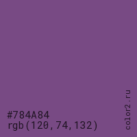 Цвет #784A84 в цветовой модели RGB обозначается тремя октетами (120, 74, 132) в десятичном формате и #784A84 в шестнадцатиричном (hex) формате, которые являются интенсивностью красного 120 (hex 78), интенсивность зелёного 74 (hex 4A) и интенсивность синего 132 (hex 84).