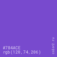 Цвет #784ACE в цветовой модели RGB обозначается тремя октетами (120, 74, 206) в десятичном формате и #784ACE в шестнадцатиричном (hex) формате, которые являются интенсивностью красного 120 (hex 78), интенсивность зелёного 74 (hex 4A) и интенсивность синего 206 (hex CE).