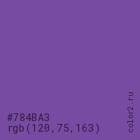 Цвет #784BA3 в цветовой модели RGB обозначается тремя октетами (120, 75, 163) в десятичном формате и #784BA3 в шестнадцатиричном (hex) формате, которые являются интенсивностью красного 120 (hex 78), интенсивность зелёного 75 (hex 4B) и интенсивность синего 163 (hex A3).
