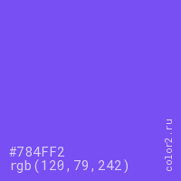 Цвет #784FF2 в цветовой модели RGB обозначается тремя октетами (120, 79, 242) в десятичном формате и #784FF2 в шестнадцатиричном (hex) формате, которые являются интенсивностью красного 120 (hex 78), интенсивность зелёного 79 (hex 4F) и интенсивность синего 242 (hex F2).