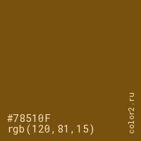 Цвет #78510F в цветовой модели RGB обозначается тремя октетами (120, 81, 15) в десятичном формате и #78510F в шестнадцатиричном (hex) формате, которые являются интенсивностью красного 120 (hex 78), интенсивность зелёного 81 (hex 51) и интенсивность синего 15 (hex 0F).