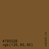 Цвет #78552B в цветовой модели RGB обозначается тремя октетами (120, 85, 43) в десятичном формате и #78552B в шестнадцатиричном (hex) формате, которые являются интенсивностью красного 120 (hex 78), интенсивность зелёного 85 (hex 55) и интенсивность синего 43 (hex 2B).