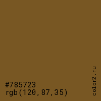 Цвет #785723 в цветовой модели RGB обозначается тремя октетами (120, 87, 35) в десятичном формате и #785723 в шестнадцатиричном (hex) формате, которые являются интенсивностью красного 120 (hex 78), интенсивность зелёного 87 (hex 57) и интенсивность синего 35 (hex 23).