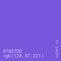 Цвет #7857DD в цветовой модели RGB обозначается тремя октетами (120, 87, 221) в десятичном формате и #7857DD в шестнадцатиричном (hex) формате, которые являются интенсивностью красного 120 (hex 78), интенсивность зелёного 87 (hex 57) и интенсивность синего 221 (hex DD).