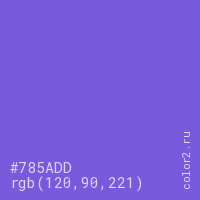 Цвет #785ADD в цветовой модели RGB обозначается тремя октетами (120, 90, 221) в десятичном формате и #785ADD в шестнадцатиричном (hex) формате, которые являются интенсивностью красного 120 (hex 78), интенсивность зелёного 90 (hex 5A) и интенсивность синего 221 (hex DD).