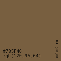 Цвет #785F40 в цветовой модели RGB обозначается тремя октетами (120, 95, 64) в десятичном формате и #785F40 в шестнадцатиричном (hex) формате, которые являются интенсивностью красного 120 (hex 78), интенсивность зелёного 95 (hex 5F) и интенсивность синего 64 (hex 40).