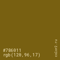 Цвет #786011 в цветовой модели RGB обозначается тремя октетами (120, 96, 17) в десятичном формате и #786011 в шестнадцатиричном (hex) формате, которые являются интенсивностью красного 120 (hex 78), интенсивность зелёного 96 (hex 60) и интенсивность синего 17 (hex 11).