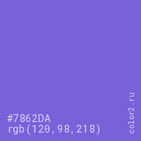 Цвет #7862DA в цветовой модели RGB обозначается тремя октетами (120, 98, 218) в десятичном формате и #7862DA в шестнадцатиричном (hex) формате, которые являются интенсивностью красного 120 (hex 78), интенсивность зелёного 98 (hex 62) и интенсивность синего 218 (hex DA).