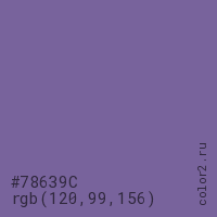 Цвет #78639C в цветовой модели RGB обозначается тремя октетами (120, 99, 156) в десятичном формате и #78639C в шестнадцатиричном (hex) формате, которые являются интенсивностью красного 120 (hex 78), интенсивность зелёного 99 (hex 63) и интенсивность синего 156 (hex 9C).