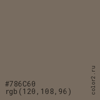 Цвет #786C60 в цветовой модели RGB обозначается тремя октетами (120, 108, 96) в десятичном формате и #786C60 в шестнадцатиричном (hex) формате, которые являются интенсивностью красного 120 (hex 78), интенсивность зелёного 108 (hex 6C) и интенсивность синего 96 (hex 60).
