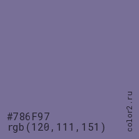 Цвет #786F97 в цветовой модели RGB обозначается тремя октетами (120, 111, 151) в десятичном формате и #786F97 в шестнадцатиричном (hex) формате, которые являются интенсивностью красного 120 (hex 78), интенсивность зелёного 111 (hex 6F) и интенсивность синего 151 (hex 97).