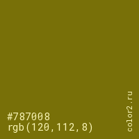 Цвет #787008 в цветовой модели RGB обозначается тремя октетами (120, 112, 8) в десятичном формате и #787008 в шестнадцатиричном (hex) формате, которые являются интенсивностью красного 120 (hex 78), интенсивность зелёного 112 (hex 70) и интенсивность синего 8 (hex 08).