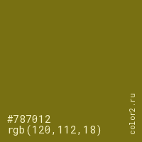 Цвет #787012 в цветовой модели RGB обозначается тремя октетами (120, 112, 18) в десятичном формате и #787012 в шестнадцатиричном (hex) формате, которые являются интенсивностью красного 120 (hex 78), интенсивность зелёного 112 (hex 70) и интенсивность синего 18 (hex 12).
