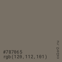Цвет #787065 в цветовой модели RGB обозначается тремя октетами (120, 112, 101) в десятичном формате и #787065 в шестнадцатиричном (hex) формате, которые являются интенсивностью красного 120 (hex 78), интенсивность зелёного 112 (hex 70) и интенсивность синего 101 (hex 65).