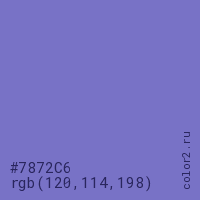 Цвет #7872C6 в цветовой модели RGB обозначается тремя октетами (120, 114, 198) в десятичном формате и #7872C6 в шестнадцатиричном (hex) формате, которые являются интенсивностью красного 120 (hex 78), интенсивность зелёного 114 (hex 72) и интенсивность синего 198 (hex C6).