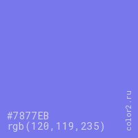 Цвет #7877EB в цветовой модели RGB обозначается тремя октетами (120, 119, 235) в десятичном формате и #7877EB в шестнадцатиричном (hex) формате, которые являются интенсивностью красного 120 (hex 78), интенсивность зелёного 119 (hex 77) и интенсивность синего 235 (hex EB).
