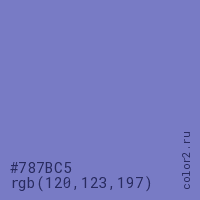 Цвет #787BC5 в цветовой модели RGB обозначается тремя октетами (120, 123, 197) в десятичном формате и #787BC5 в шестнадцатиричном (hex) формате, которые являются интенсивностью красного 120 (hex 78), интенсивность зелёного 123 (hex 7B) и интенсивность синего 197 (hex C5).