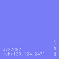 Цвет #787CF7 в цветовой модели RGB обозначается тремя октетами (120, 124, 247) в десятичном формате и #787CF7 в шестнадцатиричном (hex) формате, которые являются интенсивностью красного 120 (hex 78), интенсивность зелёного 124 (hex 7C) и интенсивность синего 247 (hex F7).
