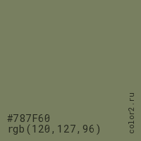 Цвет #787F60 в цветовой модели RGB обозначается тремя октетами (120, 127, 96) в десятичном формате и #787F60 в шестнадцатиричном (hex) формате, которые являются интенсивностью красного 120 (hex 78), интенсивность зелёного 127 (hex 7F) и интенсивность синего 96 (hex 60).