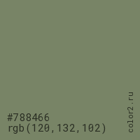Цвет #788466 в цветовой модели RGB обозначается тремя октетами (120, 132, 102) в десятичном формате и #788466 в шестнадцатиричном (hex) формате, которые являются интенсивностью красного 120 (hex 78), интенсивность зелёного 132 (hex 84) и интенсивность синего 102 (hex 66).