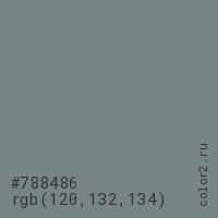 Цвет #788486 в цветовой модели RGB обозначается тремя октетами (120, 132, 134) в десятичном формате и #788486 в шестнадцатиричном (hex) формате, которые являются интенсивностью красного 120 (hex 78), интенсивность зелёного 132 (hex 84) и интенсивность синего 134 (hex 86).