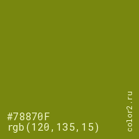 Цвет #78870F в цветовой модели RGB обозначается тремя октетами (120, 135, 15) в десятичном формате и #78870F в шестнадцатиричном (hex) формате, которые являются интенсивностью красного 120 (hex 78), интенсивность зелёного 135 (hex 87) и интенсивность синего 15 (hex 0F).
