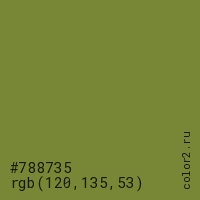 Цвет #788735 в цветовой модели RGB обозначается тремя октетами (120, 135, 53) в десятичном формате и #788735 в шестнадцатиричном (hex) формате, которые являются интенсивностью красного 120 (hex 78), интенсивность зелёного 135 (hex 87) и интенсивность синего 53 (hex 35).