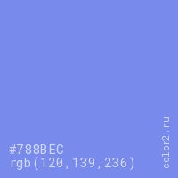 Цвет #788BEC в цветовой модели RGB обозначается тремя октетами (120, 139, 236) в десятичном формате и #788BEC в шестнадцатиричном (hex) формате, которые являются интенсивностью красного 120 (hex 78), интенсивность зелёного 139 (hex 8B) и интенсивность синего 236 (hex EC).