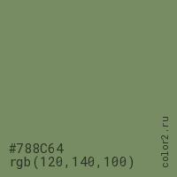 Цвет #788C64 в цветовой модели RGB обозначается тремя октетами (120, 140, 100) в десятичном формате и #788C64 в шестнадцатиричном (hex) формате, которые являются интенсивностью красного 120 (hex 78), интенсивность зелёного 140 (hex 8C) и интенсивность синего 100 (hex 64).