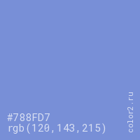 Цвет #788FD7 в цветовой модели RGB обозначается тремя октетами (120, 143, 215) в десятичном формате и #788FD7 в шестнадцатиричном (hex) формате, которые являются интенсивностью красного 120 (hex 78), интенсивность зелёного 143 (hex 8F) и интенсивность синего 215 (hex D7).