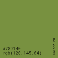 Цвет #789140 в цветовой модели RGB обозначается тремя октетами (120, 145, 64) в десятичном формате и #789140 в шестнадцатиричном (hex) формате, которые являются интенсивностью красного 120 (hex 78), интенсивность зелёного 145 (hex 91) и интенсивность синего 64 (hex 40).
