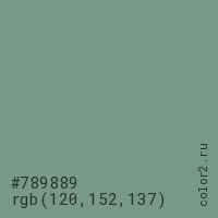 Цвет #789889 в цветовой модели RGB обозначается тремя октетами (120, 152, 137) в десятичном формате и #789889 в шестнадцатиричном (hex) формате, которые являются интенсивностью красного 120 (hex 78), интенсивность зелёного 152 (hex 98) и интенсивность синего 137 (hex 89).
