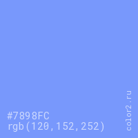 Цвет #7898FC в цветовой модели RGB обозначается тремя октетами (120, 152, 252) в десятичном формате и #7898FC в шестнадцатиричном (hex) формате, которые являются интенсивностью красного 120 (hex 78), интенсивность зелёного 152 (hex 98) и интенсивность синего 252 (hex FC).
