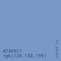 Цвет #7899C7 в цветовой модели RGB обозначается тремя октетами (120, 153, 199) в десятичном формате и #7899C7 в шестнадцатиричном (hex) формате, которые являются интенсивностью красного 120 (hex 78), интенсивность зелёного 153 (hex 99) и интенсивность синего 199 (hex C7).