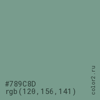 Цвет #789C8D в цветовой модели RGB обозначается тремя октетами (120, 156, 141) в десятичном формате и #789C8D в шестнадцатиричном (hex) формате, которые являются интенсивностью красного 120 (hex 78), интенсивность зелёного 156 (hex 9C) и интенсивность синего 141 (hex 8D).
