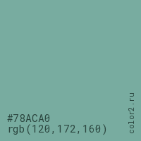 Цвет #78ACA0 в цветовой модели RGB обозначается тремя октетами (120, 172, 160) в десятичном формате и #78ACA0 в шестнадцатиричном (hex) формате, которые являются интенсивностью красного 120 (hex 78), интенсивность зелёного 172 (hex AC) и интенсивность синего 160 (hex A0).