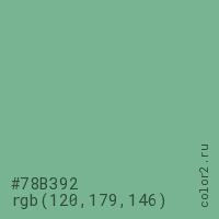 Цвет #78B392 в цветовой модели RGB обозначается тремя октетами (120, 179, 146) в десятичном формате и #78B392 в шестнадцатиричном (hex) формате, которые являются интенсивностью красного 120 (hex 78), интенсивность зелёного 179 (hex B3) и интенсивность синего 146 (hex 92).