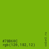 Цвет #78B60C в цветовой модели RGB обозначается тремя октетами (120, 182, 12) в десятичном формате и #78B60C в шестнадцатиричном (hex) формате, которые являются интенсивностью красного 120 (hex 78), интенсивность зелёного 182 (hex B6) и интенсивность синего 12 (hex 0C).