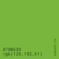Цвет #78B63D в цветовой модели RGB обозначается тремя октетами (120, 182, 61) в десятичном формате и #78B63D в шестнадцатиричном (hex) формате, которые являются интенсивностью красного 120 (hex 78), интенсивность зелёного 182 (hex B6) и интенсивность синего 61 (hex 3D).