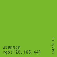 Цвет #78B92C в цветовой модели RGB обозначается тремя октетами (120, 185, 44) в десятичном формате и #78B92C в шестнадцатиричном (hex) формате, которые являются интенсивностью красного 120 (hex 78), интенсивность зелёного 185 (hex B9) и интенсивность синего 44 (hex 2C).