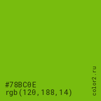 Цвет #78BC0E в цветовой модели RGB обозначается тремя октетами (120, 188, 14) в десятичном формате и #78BC0E в шестнадцатиричном (hex) формате, которые являются интенсивностью красного 120 (hex 78), интенсивность зелёного 188 (hex BC) и интенсивность синего 14 (hex 0E).